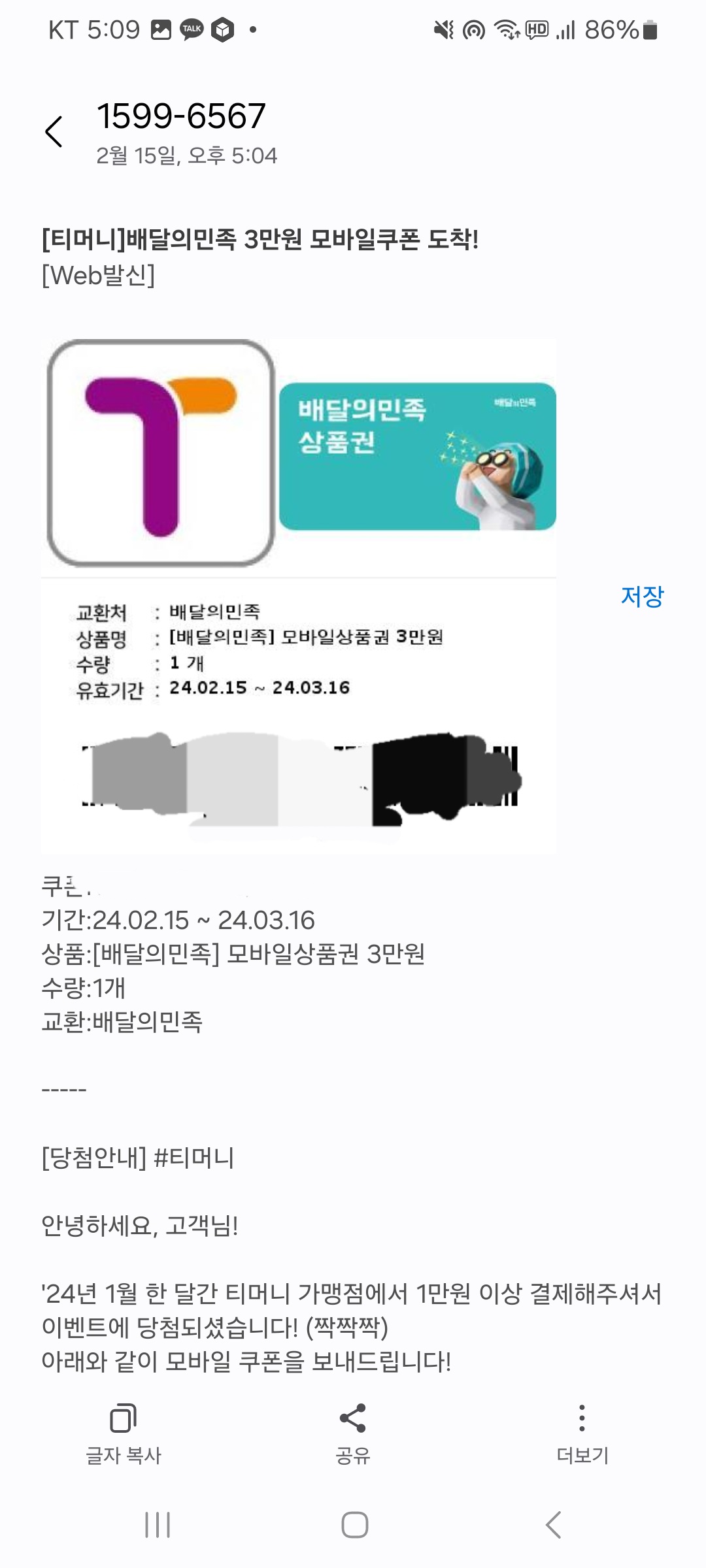 [티머니]배달의민족 3만원 모바일쿠폰 도착!