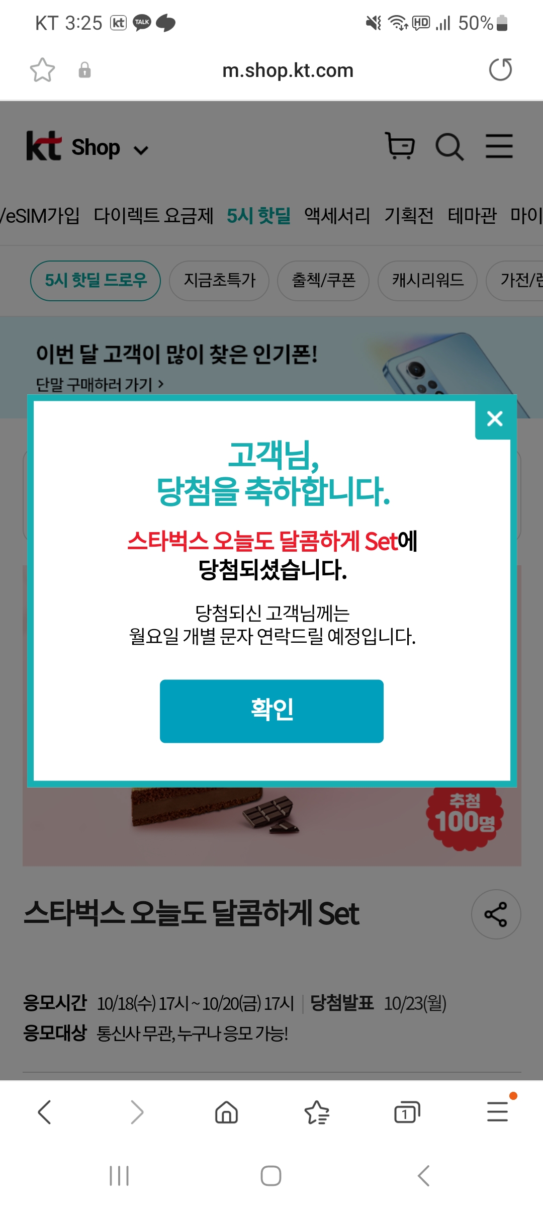 KT 5시 핫딜(푸드딜) 실제당첨 후기