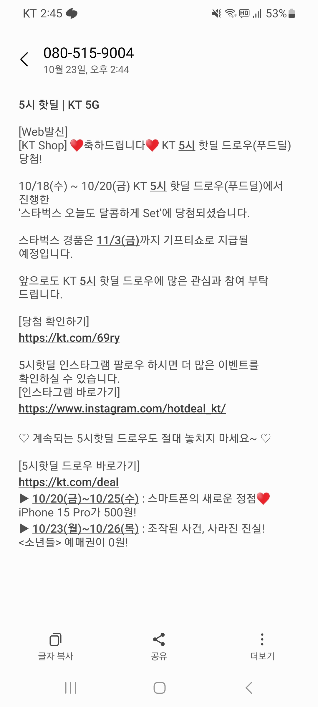 폰을 보는데 당첨되었다는 문자가 오는거에요~
